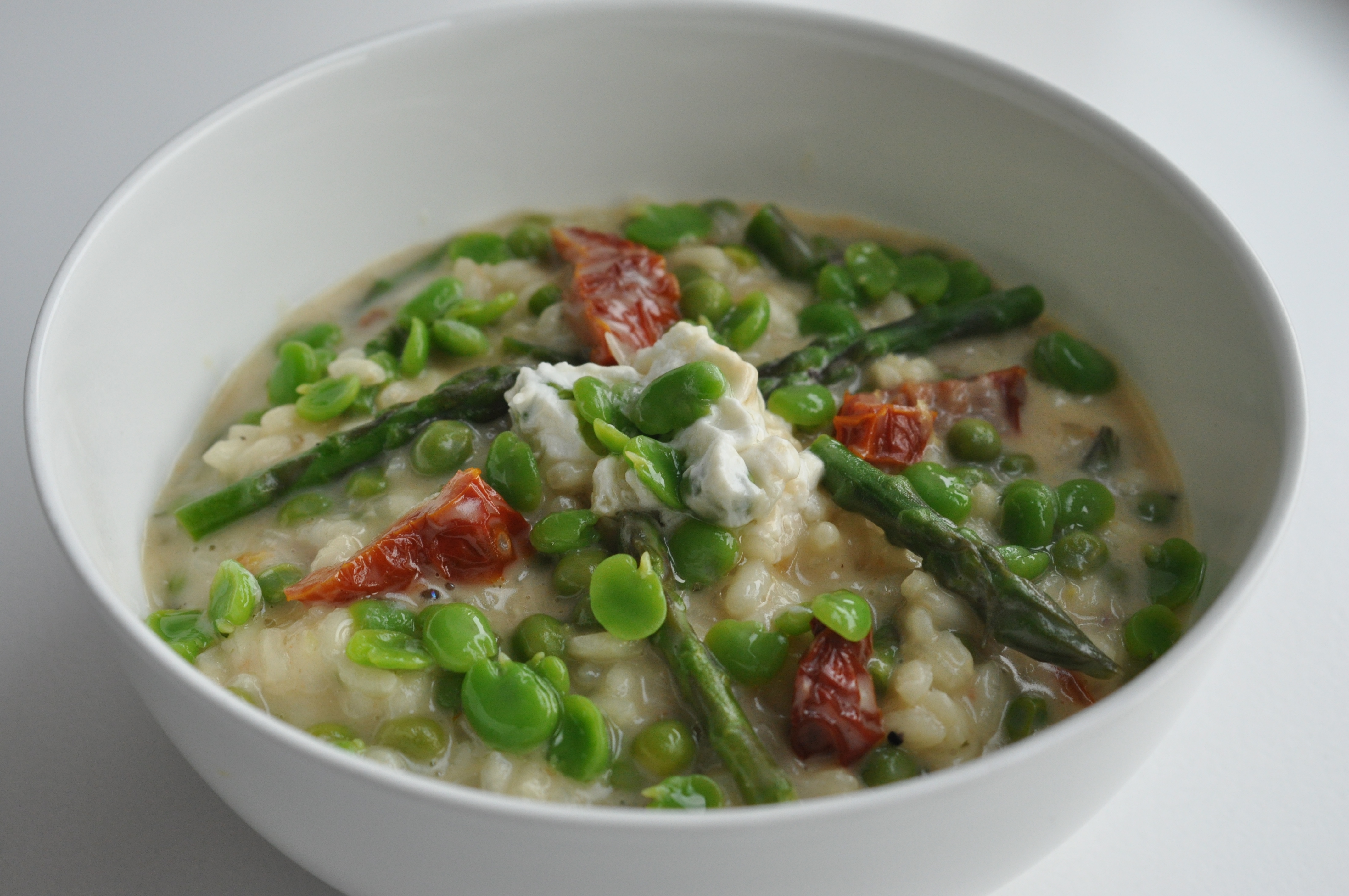 To get risotto rice perfectly ‘al dente’ it needs to boil for approximately 16 minutes. After the rice has become translucent you can start by first adding the wine and then a ladle of stock to the rice and let it cook, gently stirring from the center to the side. Turn up the heat a little if necessary. Continue adding the stock, ladle by ladle, while stirring, allowing the rice to cook and the stock to be absorbed each time. After about 6 minutes add the dried tomatoes so they get some time to absorb the stock and to become a bit softer. Meanwhile just keep stirring and adding stock. After 5 more minutes add the broad beans and peas and keep stirring for the last 5 minutes.